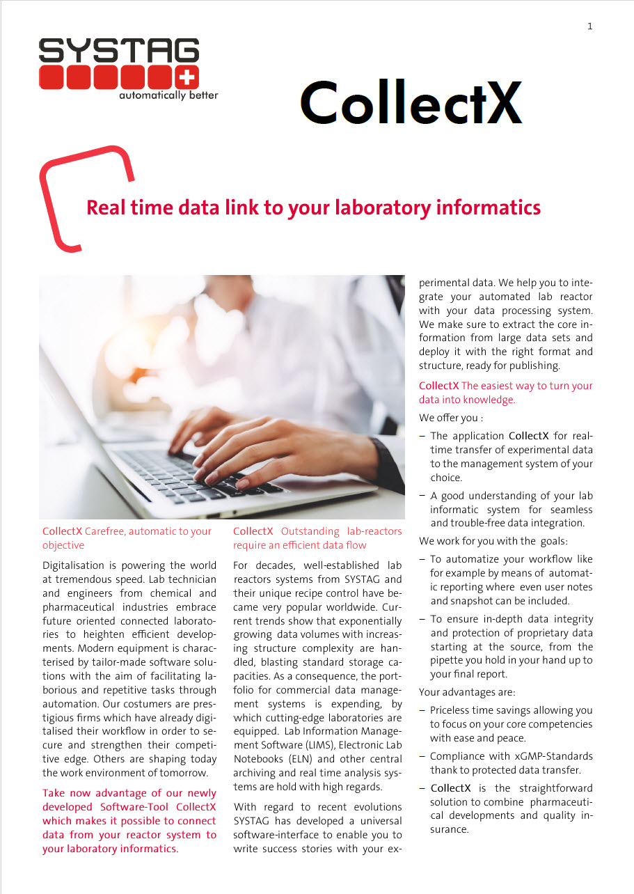 Take now advantage of our newly Developed Software-Tool CollectX which makes it possible to connect data from your reactor system to your laboratory informatics
